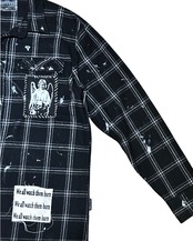 古着のチェックシャツにダメージ加工とパッチを縫い付けてあります。